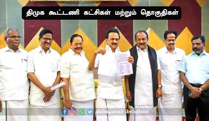 இதில், கூட்டணிக் கட்சிகளுக்கான தொகுதி பங்கீட்டை வெற்றிகரமாக ஸ்டாலின் தலைமையிலான திமுக கட்சி முடித்து தொகுதிகள் விவரத்தை வெளியிட்டுள்ளது. அதன்படி,