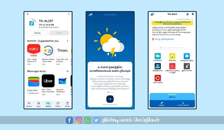 பேரிடர் குறித்த வானிலை முன்னெச்சரிக்கையினை அறிந்து கொண்டு, அதற்கேற்ப பொதுமக்கள் ஆயத்த நடவடிக்கைகள் மேற்கொள்ள உதவும் TN- Alert செயலியை கூகுள் பிளே ஸ்டோர் (Google Play Store) மற்றும் ஐஓஎஸ் ஆஃப் ஸ்டோர் (IOS App Store)ல் இருந்து பதிவிறக்கம் செய்து பொதுமக்கள் பயனடையலாம்.